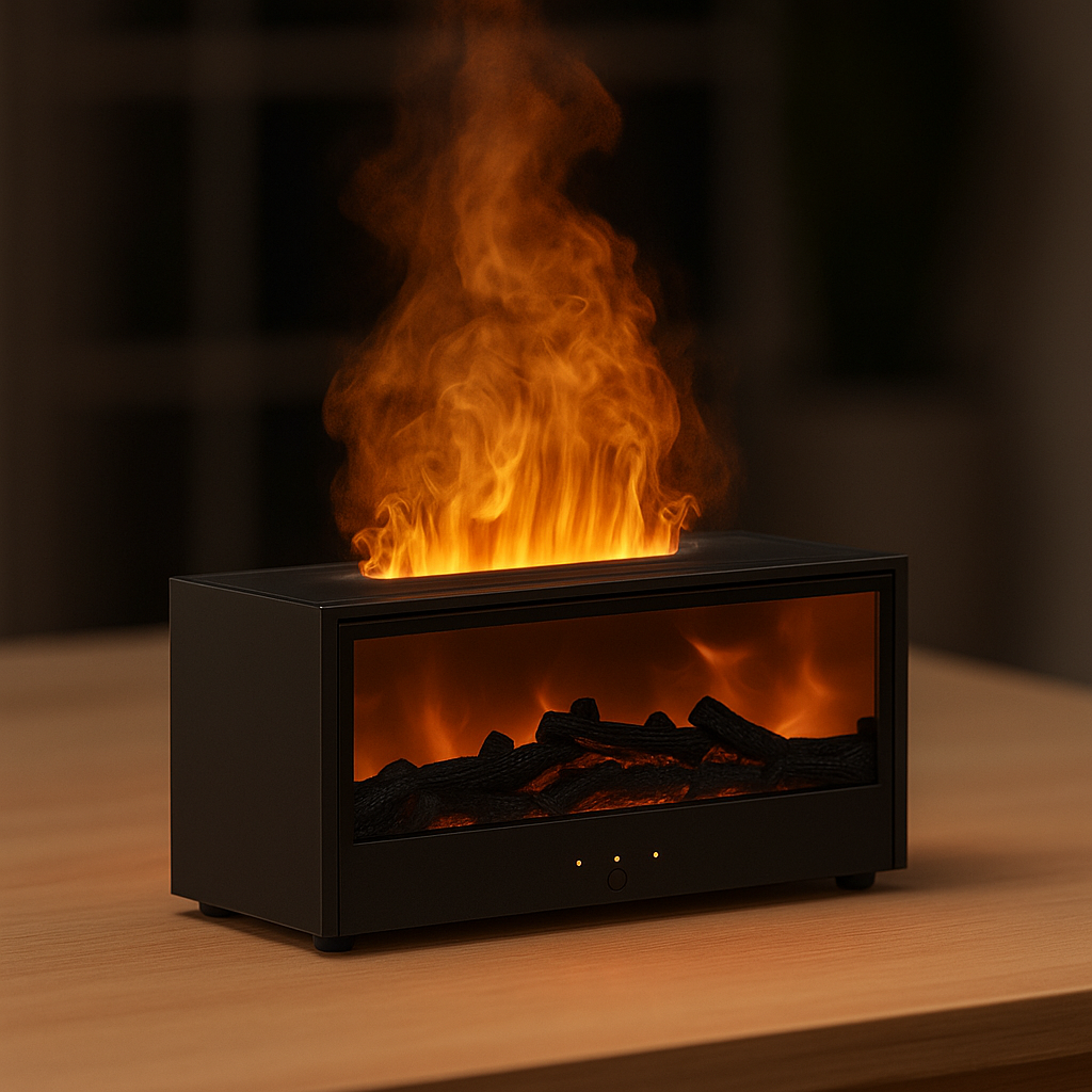 Der kompakte Tisch-„Kamin“ zaubert mit seinem realistischen Flammeneffekt sofort Gemütlichkeit in jeden Raum. Gleichzeitig verteilt der leise Nebel deine Lieblingsdüfte – ganz ohne Rauch oder offene Flamme. Minimalistisches Design, sanftes Licht und beruhigendes Knistern-Feeling für Wohnzimmer, Schlafzimmer oder Home-Office.