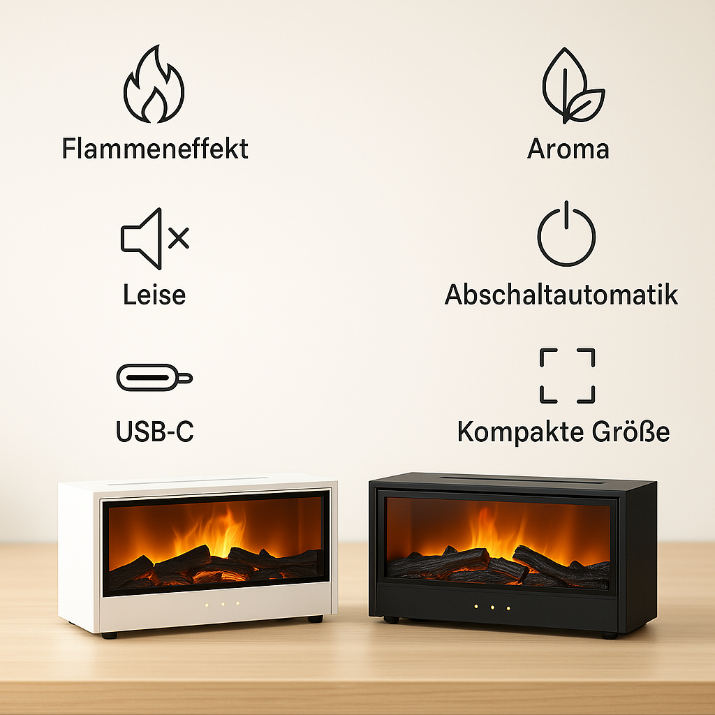 Der 3D Fireplace Diffuser liefert Kamin-Atmosphäre ohne Rauch, vernebelt Aroma für Wohlfühl-Duft und arbeitet leise. Mit Abschaltautomatik bei Wassermangel, flexibler USB-C-Stromversorgung und kompakter Grösse passt er überall hin – sicher, stimmungsvoll, platzsparend. Hol dir jetzt deinen eigenen Fireplace Diffuser – wähle Schwarz oder Weiss, passend zu deinem Stil.